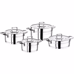 این سرویس قابلمه دارای 8 پارچه با طرح ساده ی نقره ای نیمه مات زیبا و شیک است که دستگیره و قپه های تمام نقره ای را دارا است. بدنه این سرویس قابلمه 8 پارچه اویم سارای از آلیاژ ویژهای میباشد که پخت و پز شما را راحت و کیفیت و طعم غذای شمارا بهتر می کند. بدنه آن تمام استیل و پایه های سوپر کپسولی و 3 لایه با روکش فولادی است که گرما و حرارت را به طور یکنواخت و یکسان پخش میکند که طبخ یکدستی به شما می دهد.